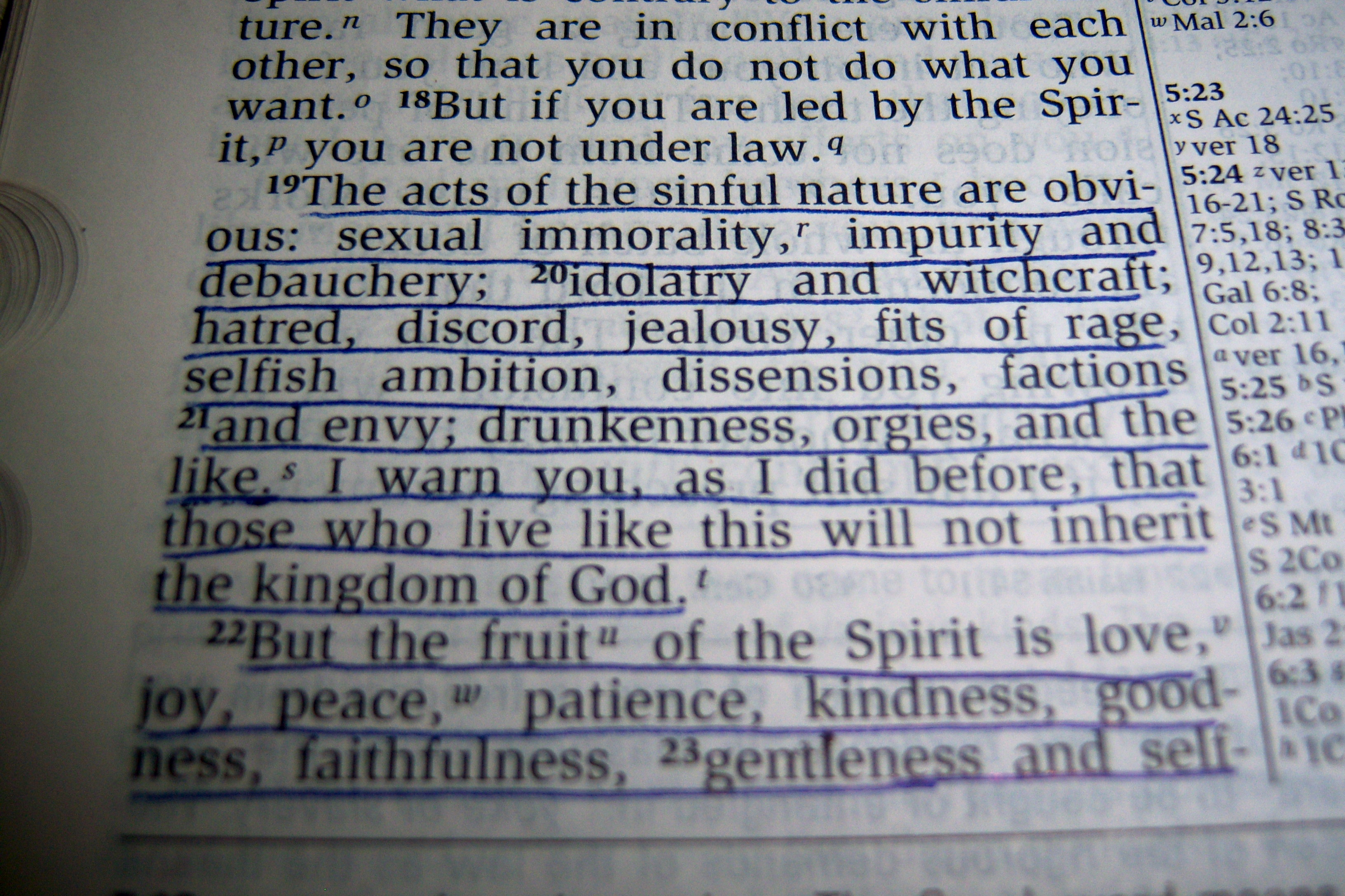 Key Verses: Galatians 5:19-24 “The acts of the sinful nature are obvious: sexual immorality, impurity and debauchery; idolatry and witchcraft; hatred, discord, jealousy, fits of rage, selfish ambition, dissensions, factions and envy; drunkenness, orgies, and the like. I warn you, as I did before, that those who live like this will not inherit the kingdom of God. But the fruit of the Spirit is love, joy, peace, patience, kindness, goodness, faithfulness, gentleness and self-control. Against such things there is no law. Those who belong to Christ Jesus have crucified the sinful nature with its passions and desires.”