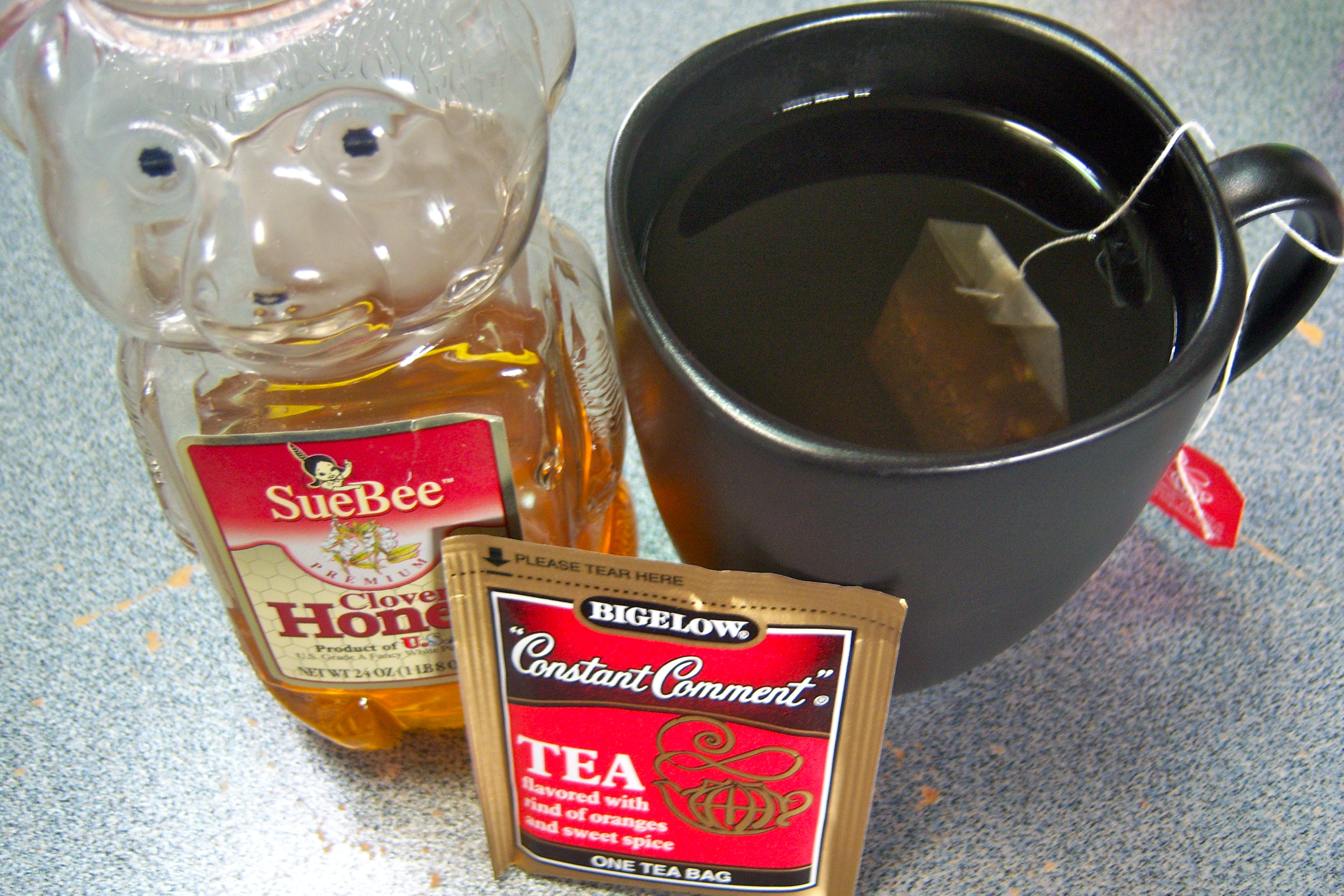I am drinking my favorite orange-spice tea sweetened with yummy honey!