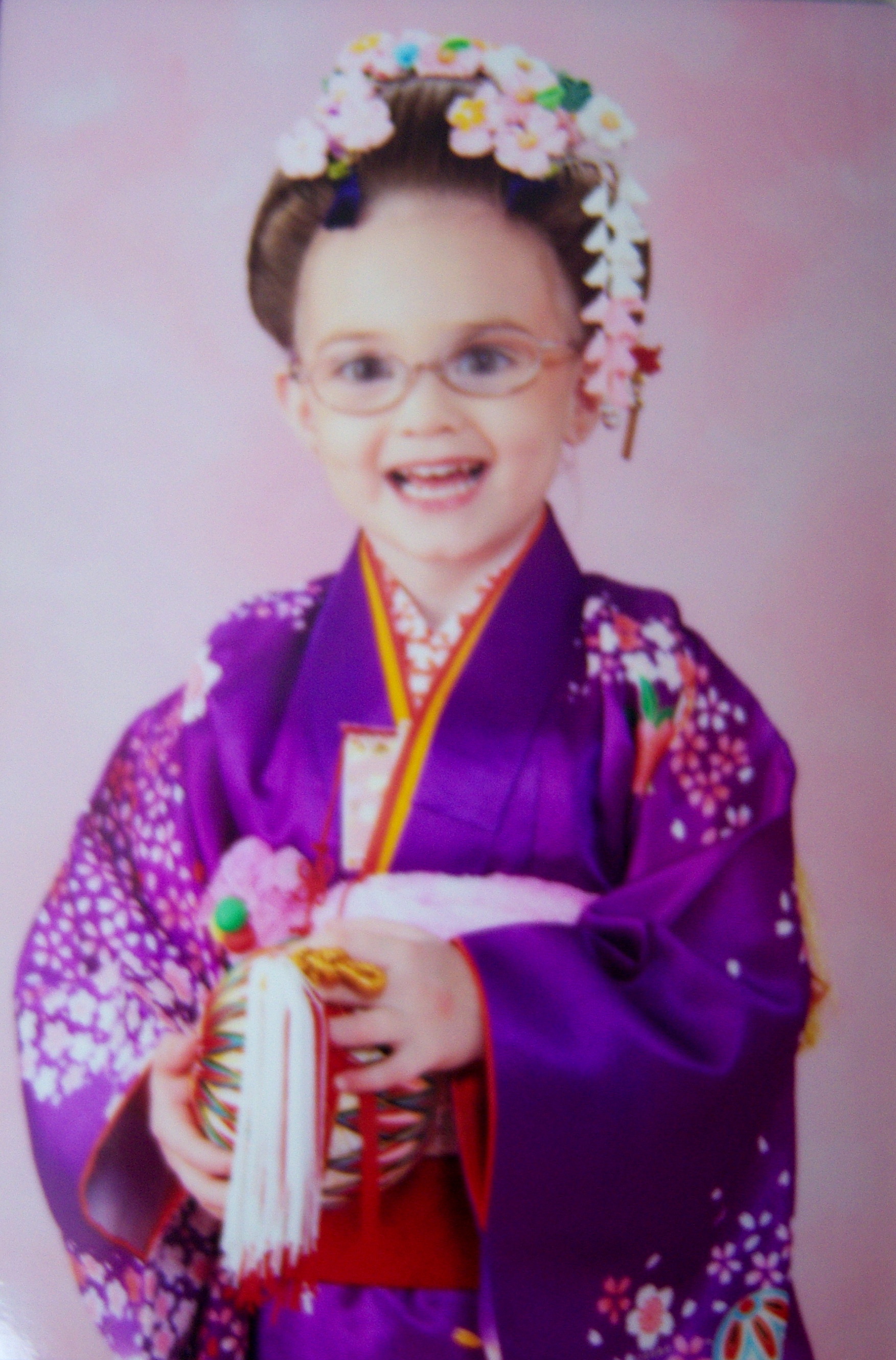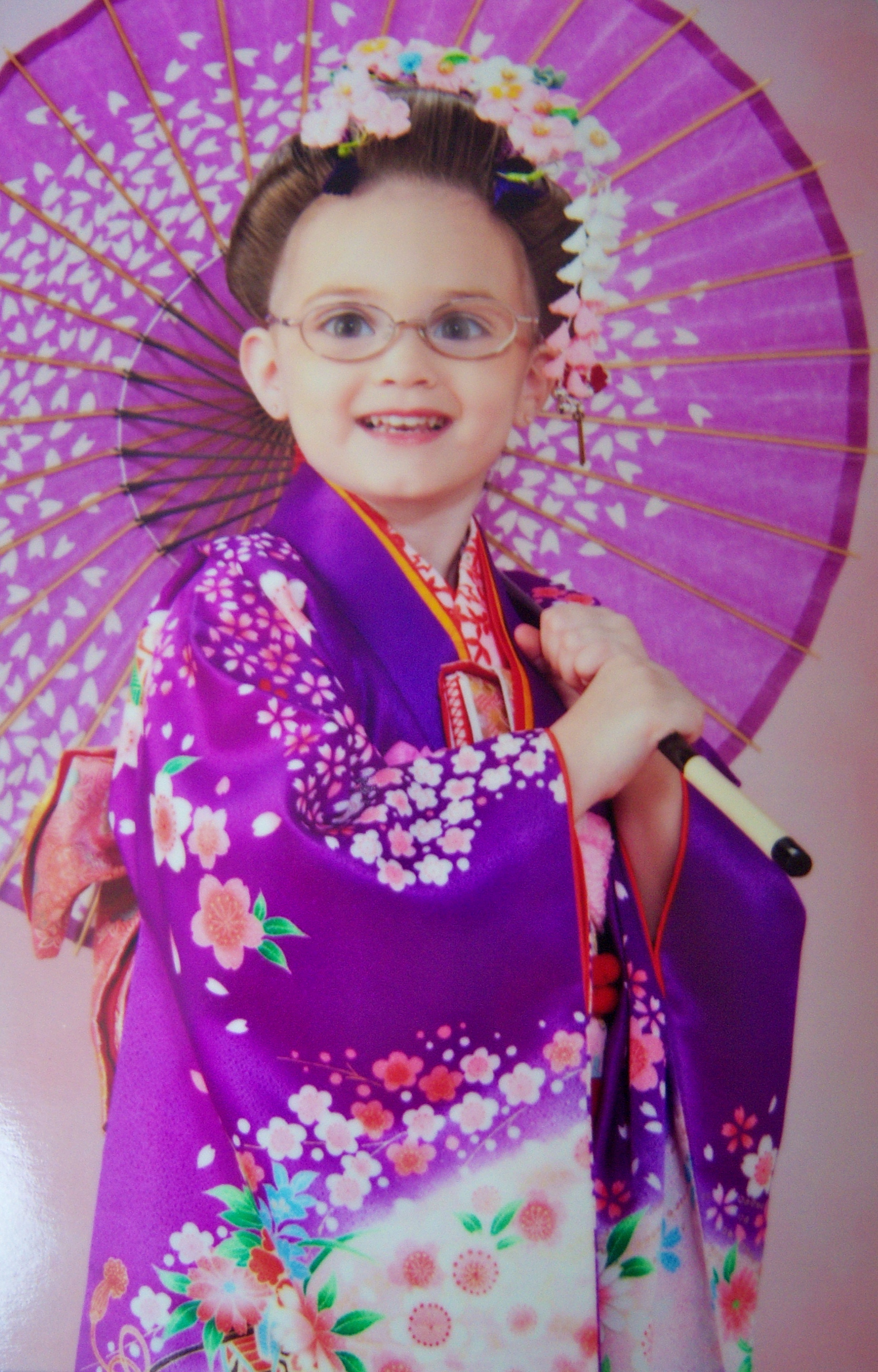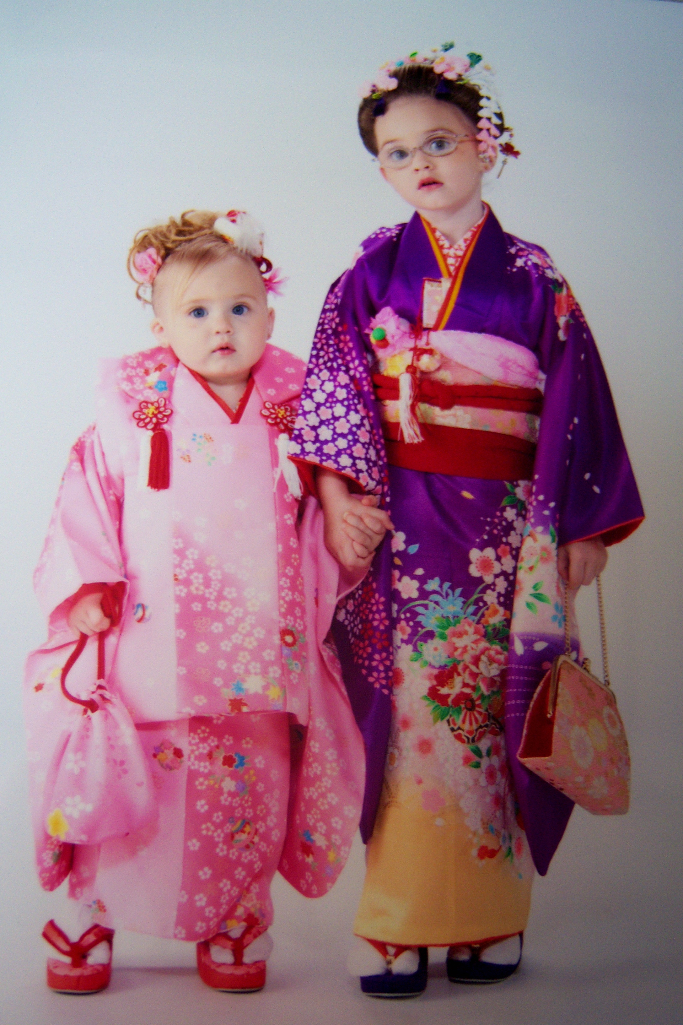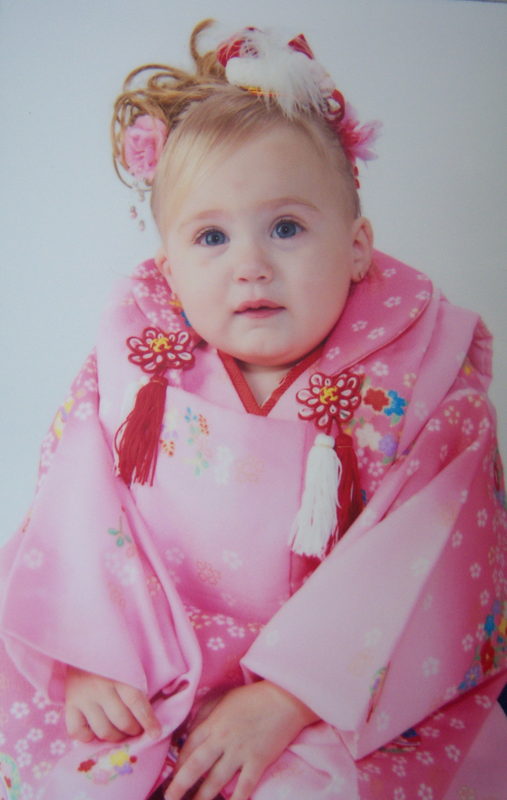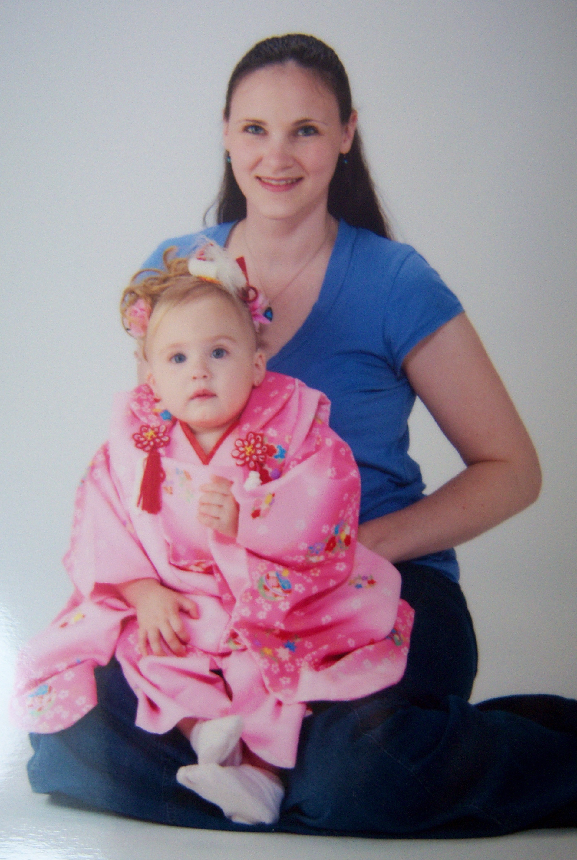 Kendal was very excited! I kept telling her that she was going to be a Japanese Princess. She did really well with posing; but she focusing so hard on posing that she didn’t smile in most of her pictures (these were the only ones where she smiled). Audrey did not like being in the Kimono and started screaming the moment the mamasan started to dress her. She calmed down when Kendal was getting her pictures taken. They attempted to get them to pose together but they kept walking toward the camera. After a couple of shots; Audrey started screaming again. She would not calm down unless I was holding her. So, I finally told them to take a picture with me holding her (the reason why I am not wearing a Kimono is because I never intended to have my picture taken). I leaned as far out of the shot as possible for the top picture of Audrey.