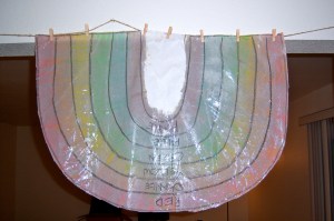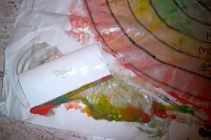 5. Then, I carefully cut out the rainbow (because it is wet it can tear easily) and hung it to dry. I recommend hanging so that air can get to both sides to dry quicker.