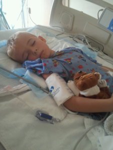 UPDATE June 23, 2011: Today, Greysen walked one loop around the floor and the therapist was pleased. She said he looks great and his only neurological deficit involves his left arm. He has the ability to move it but he doesn’t. She said it was weak & “floppy”…but a little time in PT & he should regain it. This evening, he woke up and in minutes went from okay to screaming in pain which brought back vomiting. The nurse gave him his pain meds through IV and he’s beginning to relax…