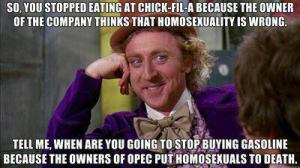 Of course, the gay community immediately jumped to the conclusion that Chick Fil-A and its CEO and owners hates all gays. This is something that I do not understand. Why does disagreeing with homosexuality automatically equal hatred towards or afraid of homosexuals? I might disagree with someone on any topic (religion, how to raise kids, what movies or books we like, how we spend our money, etc) but that doesn’t mean I hate them or am afraid of them. In my opinion, only when someone’s actions show that they are hateful or afraid, should that argument be used (such as Westboro church has so frequently demonstrated). Anyway, due to their misguided opinion, a lot of the liberal community has declared a boycott on Chick Fil-A. For some reason, it seems as though gays only seem to have an intolerance toward Christians and Christian companies when Biblically based beliefs are expressed. I wonder if they realize that all Abrahamic religions (Christian, Judaism, Islam) as well as other world religions find homosexuality morally wrong.