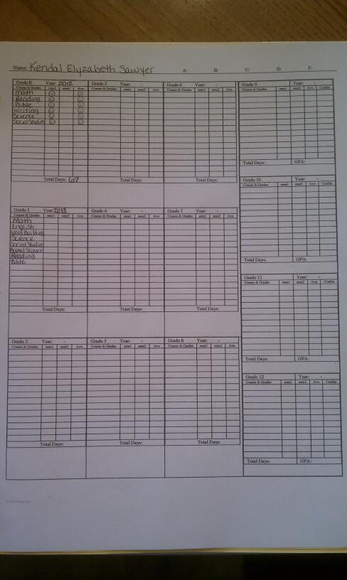GRADES: I have two sheets to record grades. First, to record K-12 grades, I use this Long Term Grade Record also found DonnaYoung.org. As of now, I do not know how many years that I will homeschool. For us, it will be a year to year decision based on prayer, where we are currently located (we are military), state homeschooling laws, and how the girls are doing with school. But, I want to be prepared for however long we do homeschool and have everything recorded in one place so that if the state requests to see records I will have them available.