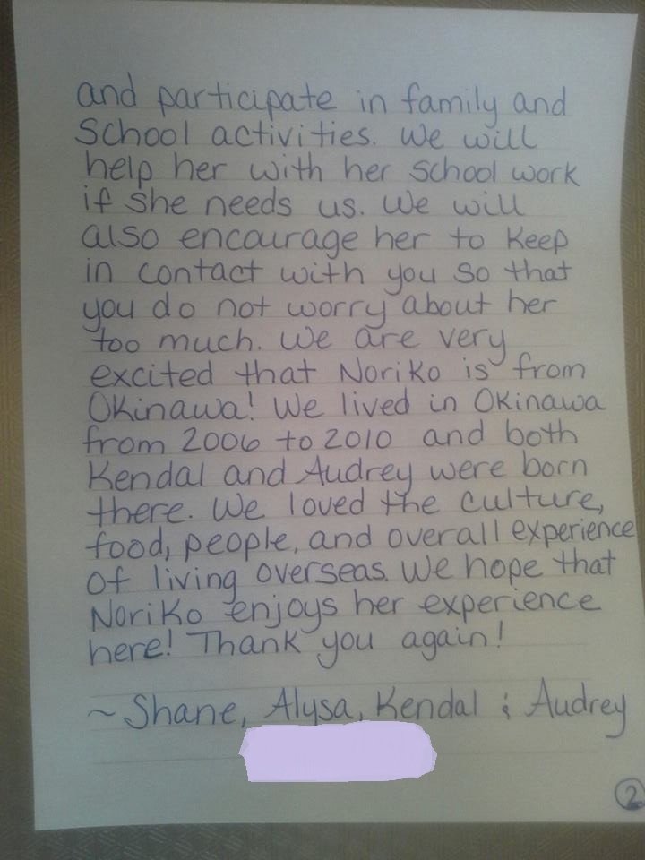 I also wrote a letter to Noriko’s parents in an effort to hopefully make them more comfortable with having their daughter spending the year with us.